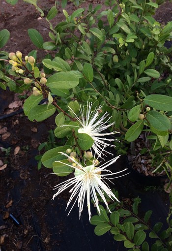 Capparis flexuosa is a native winding or climbing shrub with beautiful flowers which consists mainly of stamens.